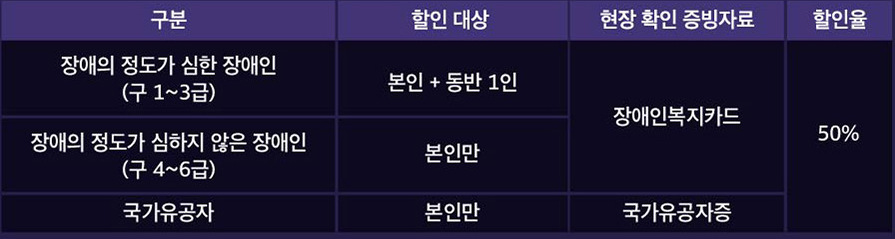 - 할인은 예매 시 적용 가능하며, 일반 권종으로 예매 후 현장에서 할인적용(차액 환불)이 불가
