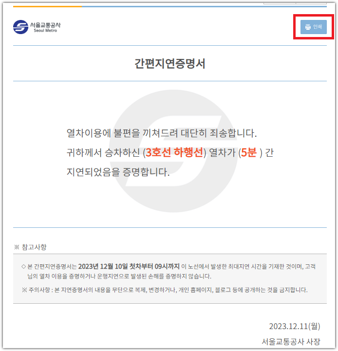 서울교통공사 홈페이지에서 간편하게 지연증명서를 발급받을 수 있습니다. 필요한 노선과 시간을 선택해 PDF로 저장하거나 출력하면 공식 문서로 활용할 수 있습니다.