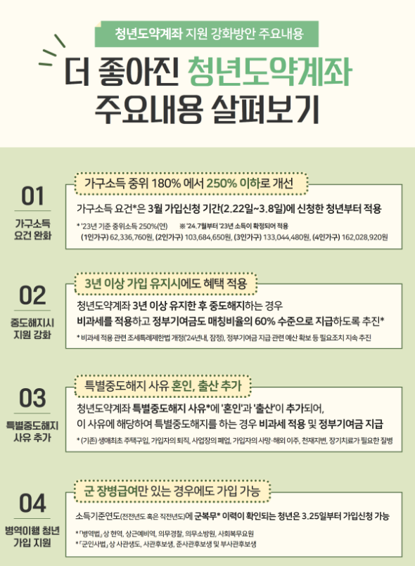 - 소득 기준: 직전 과세기간의 총급여액이 7,500만 원 이하(종합소득금액 6,300만 원 이하)여야 하며, 가구원 수에 따라 기준 중위소득의 250% 이하여야 합니다. 이는 청년들이 보다 쉽게 가입할 수 있도록 소득 기준이 완화된 것입니다.
