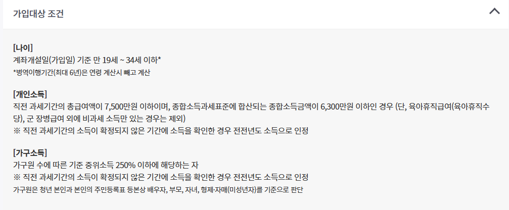 - 다른 정부 지원 상품 가입자: 청년희망적금 등 유사한 정부 금융상품 가입자는 중복 가입이 불가.