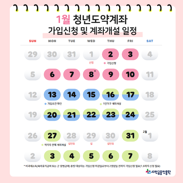 - 신청 기간: 청년도약계좌는 매년 정해진 기간에 신청할 수 있으며, 2024년에는 1월 2일부터 10일까지 신청이 가능합니다. 이 기간 내에 신청하지 않으면 다음 기회를 기다려야 합니다.