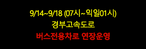 <9. 13.(금) ~ 9. 18.(수)><사전 홍보(예시)> 서울시 미래첨단교통과 @seoultopis[안내] 추석 연휴 경부고속도로 버스전용차로는 07시부터 익일 01시까지 연장 운영됩니다.