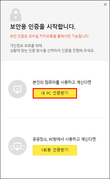 카카오 PC 버전에 로그인했다고 끝이 아닙니다. 보안인증도 마쳐야 완벽하게 설치가 됩니다.