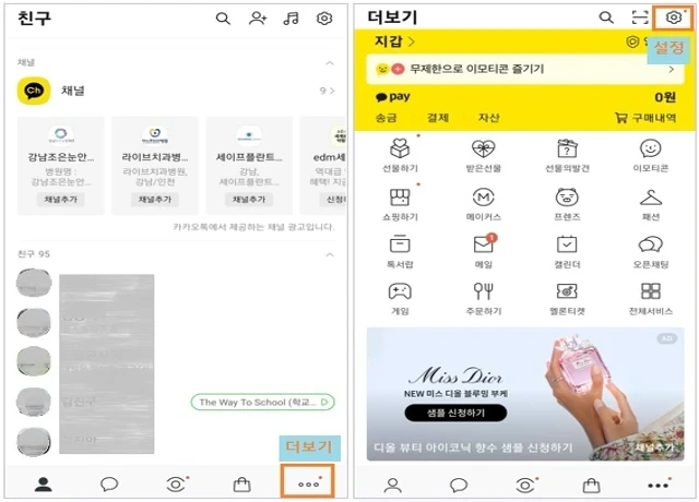 ① 모바일 카카오톡 > 더보기[···] > 우측 상단에서 설정을 탭합니다.