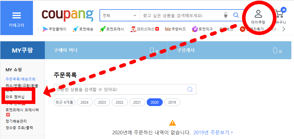 쿠팡 홈페이지에서 마이쿠팡을 클릭합니다. 그리고 마이쿠팡 화면에서 왼쪽 메뉴들에서 와우 멤버십을 찾아 클릭해주세요.