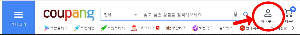 PC에서 쿠팡 홈페이지에 접속 후 로그인 합니다.