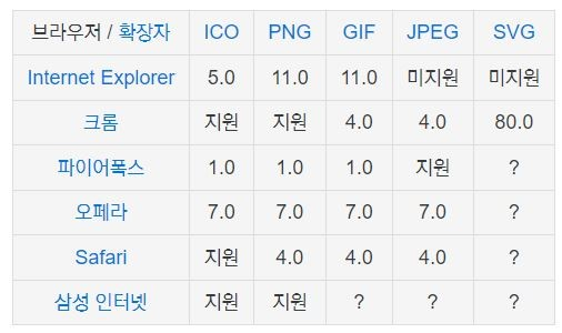 파비콘은 대표적으로 ico을 사용하지만 대부분의 브라우저가 ico와 png를 모두 지원합니다. 최근에는 png의 사용도 늘어나고 있고 jpg, gif 형식도 활용되고 있습니다. Svg는 백터 이미지로 크기 변환에 편리하지만 지원하는 브라우저가 아직 제한적이라 많이 사용되지 않습니다.