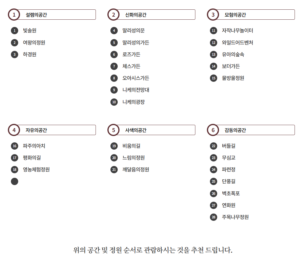 설렘의 공간에는 멋드러진 국화 조형물들이 여왕의 정원과 어울려 설치되며, 자유의 공간에는 30여종이 넘는 그라스들과 어우러진 각종 식물들을 관람할 수 있다. 특히, 2024년 새롭게 오픈한 신화의공간 말리성의가든은 유럽의 궁전 정원 여행을 방불케 하는 경험을 선사한다.