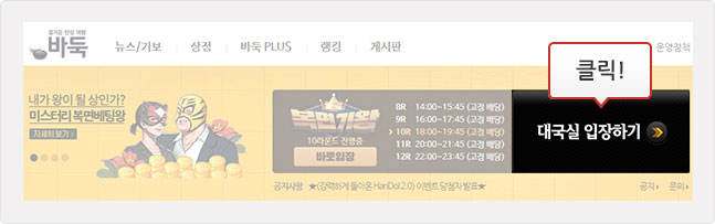 홈페이지 우측 상단의 ‘대국실 입장하기’ 버튼 클릭 시 게임창이 열립니다.