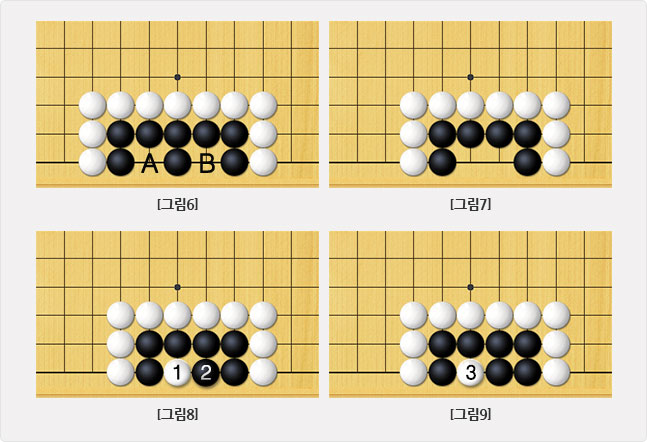 [그림6]의 A나 B자리는 백에게 있어서 착수금지 지점이기 때문에 둘 수 없습니다.