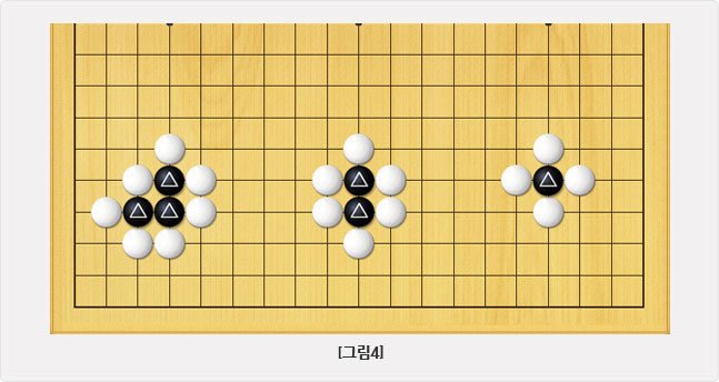 [그림4]와 같이 흑돌의 도망갈 곳(활로)을 백돌이 모두 막은 경우,