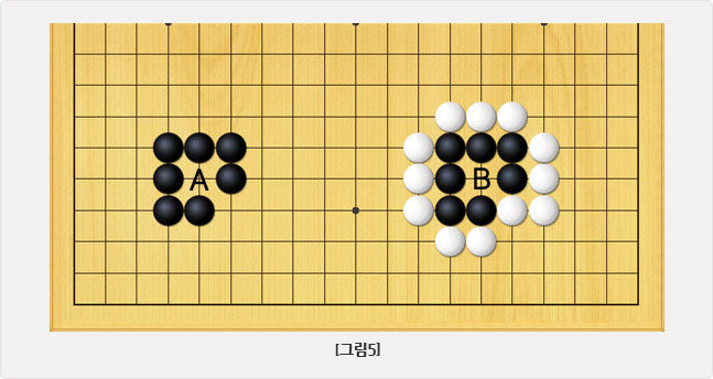 (단, [그림5]의 B지점은 백이 착수하여 흑돌을 따낼 수 있으므로 착수금지가 아닙니다.)