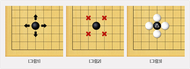 [그림1]의 화살표로 표시된 지점이 흑의 활로이며, [그림2]의 대각선은 흑의 활로가 아닙니다.