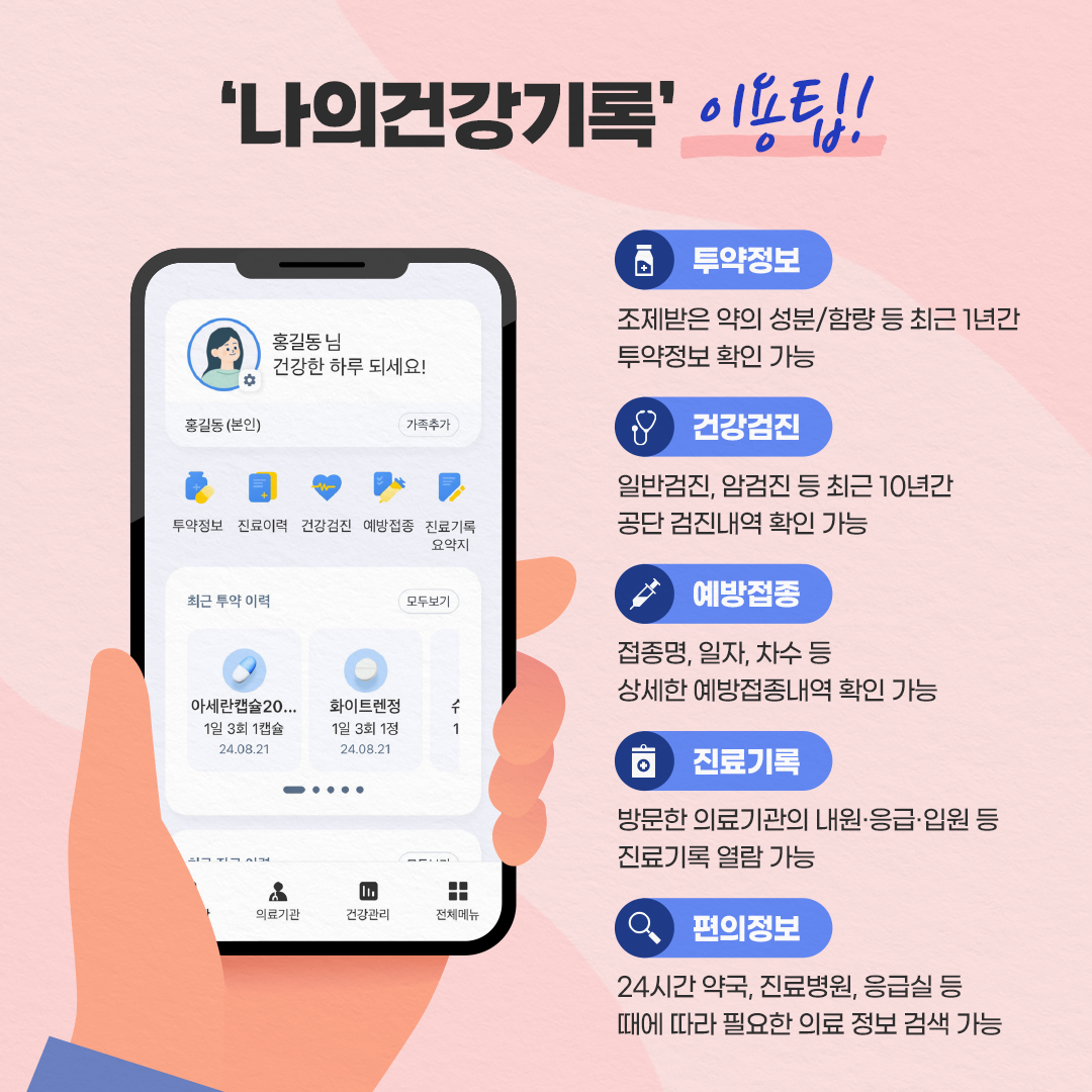 진료, 약물 처방, 건강검진, 예방접종 등 이력들을