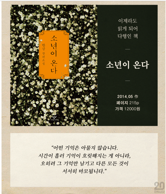 또 다른 주요 작품이자, 베스트셀러이기도 한 '소년이 온다'는 1980년 광주 민주화 운동을 배경으로 하여 역사적 사건 속 개인의 아픔과 희생을 다룬다. 이 작품은 한강이 세계적인 작가로 인정받는 계기가 됐다. 그는 이 작품을 통해 다수 문학상을 수상했다. 한강의 문학은 종종 고통과 회복, 기억과 망각, 정체성과 소외 같은 주제를 탐구하며, 강렬하고 시적인 언어로 독자 마음을 사로잡는다.