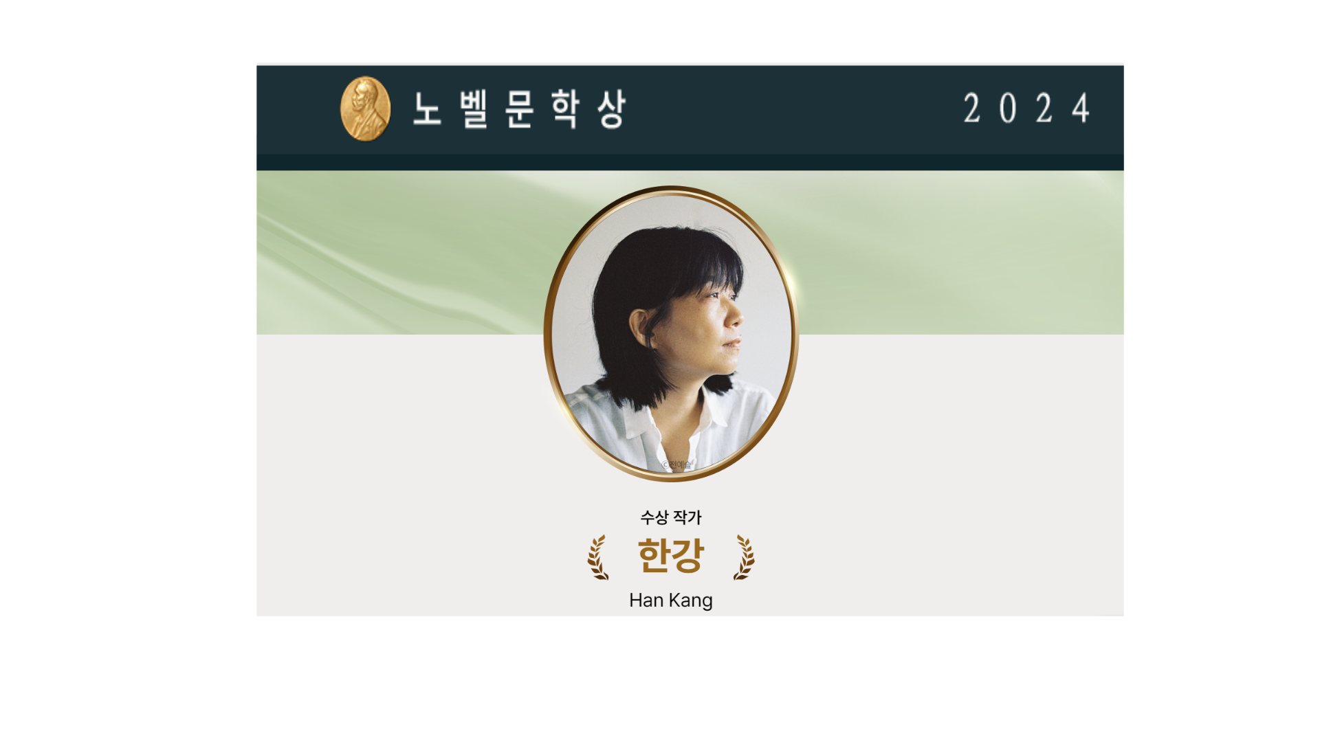 2024년 노벨문학상 수상자로 소설가 한강(54)이 선정됐다. 국내 작가로는 최초이고, 아시아 여성 작가로도 최초다. 노벨상 전체로 보면 2000년 노벨평화상을 받은 고 김대중 전 대통령 이후 두번째 한국인 수상자다. 작가가 소설로 등단한 지 꼭 30년 만, 국내에 최초 근대 소설이 소개된 지 107년 만의 영예다. 그동안 시인 고은이 후보군으로 거명된 적이 있으나, 한강 작가가 50대에 전세계에서 가장 권위 있는 문학상을 거머쥐리라 예상한 이는 거의 없었다.