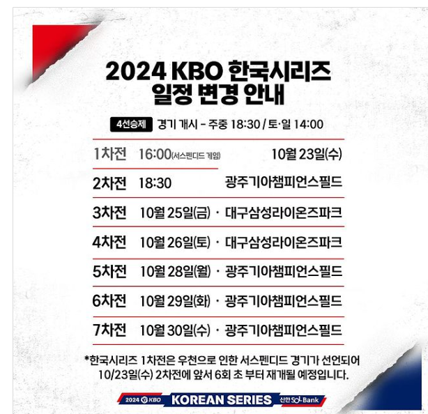 2024 신한 SOL뱅크 KBO 한국시리즈 1차전 서스펜디드 경기 및 오후 6시 30분으로