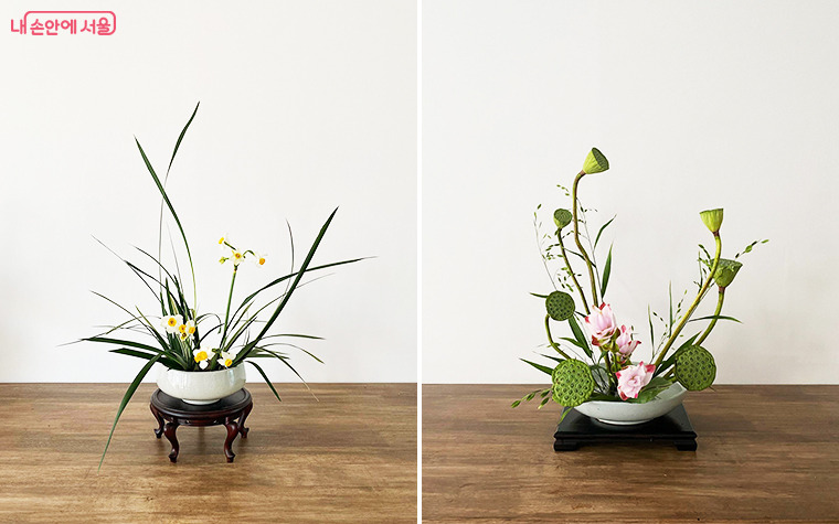 ‘분경, 여백에 담은 풍경’은 홍건익가옥에서 진행하는 프로그램으로, 침봉(굵은 침이 꽂혀 있어 나뭇가지나 꽃의 줄기를 꽂아 고정하는 꽃꽂이 도구)을 이용한 전통 꽃꽂이 체험이다.