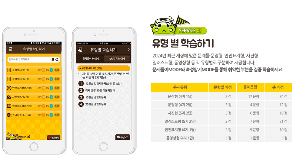 - 문장형, 안전표지형, 사진형, 일러스트형, 동영상형 등 운전면허 학과시험 유형별로 문제를 학습할 수 있는 기능 제공.