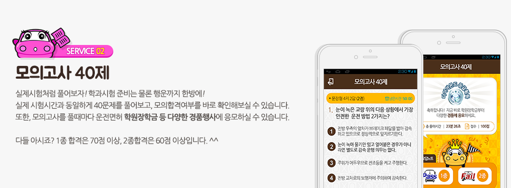 - 실제 운전면허 학과시험 시간과 동일하게 40문제를 풀어보고, 모의합격여부를 즉시 확인해볼 수 있는 기능 제공.