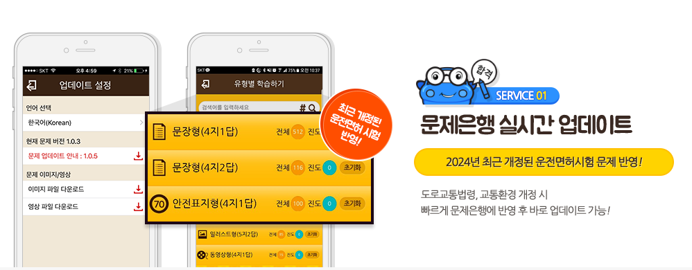 - 1종 보통/대형/특수, 2종 보통/소형/원동기 등 시험보는 문제들만 골라서 집중학습!