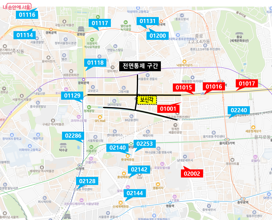 보신각 주변을 경유하는 버스 노선은 12월 31일 00시부터 다음날인 1월 1일 07시까지 임시 우회한다.