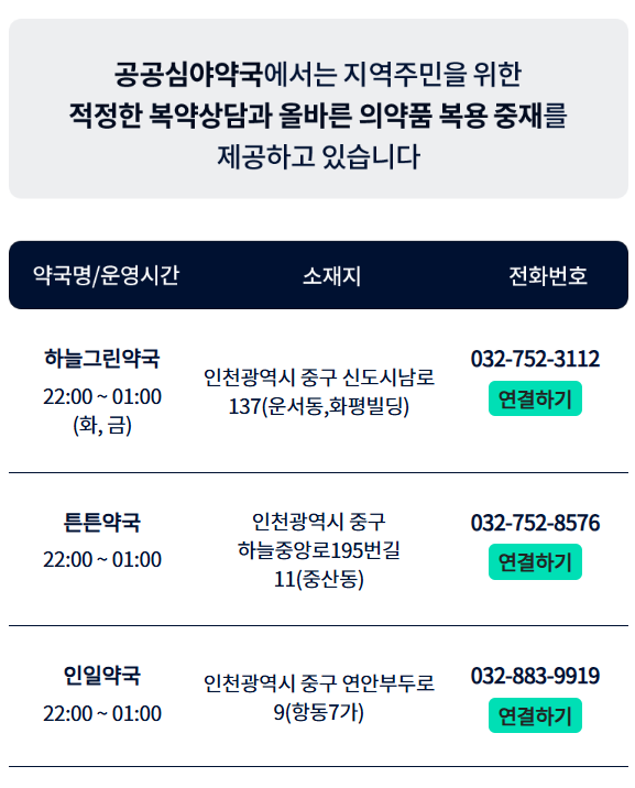 - 운영 시간: 기본적으로 오후 10시 ~ 다음 날 오전 1시 (약국별로 상이)