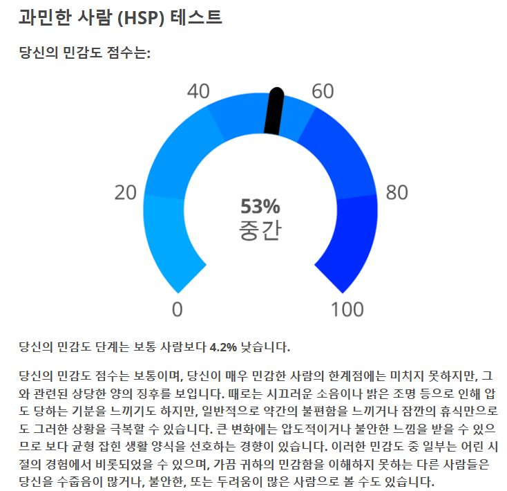 ⭕ 테스트 점수가 높을 수록, 매우 예민한 사람들(HSP)이 가진 특성을 갖고 있다고 이해할 수 있습니다.