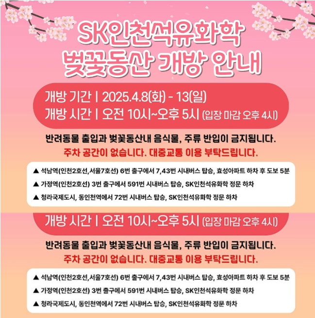 ■ 일시 4월 8일(화)부터 13일(일)까지 6일 동안 SK인천석유화학 벚꽃동산 임시 개방